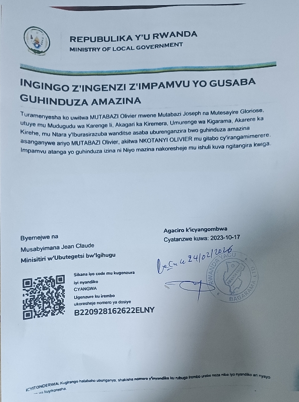 Uwitwa MUTABAZI OLIVIER , mwene Mutabazi Joseph na Mutesayire Gloriose, yandikiye MINALOC, asaba uburenganzira bwo guhinduza amazina asanganywe ariyo MUTABAZI OLIVIER, akitwa NKOTANYI OLIVIER, Mu gitabo cy’irangamirere.Impamvu asaba yo guhinduza izina ni izina yakoresheje mu ishuri kuva agitangira kwiga.