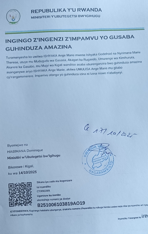 Uwitwa ISHYAKA ANGE MARIE Mwene ISHYAKA Godefroid, Nyiramana Marie, yandikiye MINALOC, asaba uburenganzira bwo guhinduza amazina asanganywe, ariyo :ISHYAKA ANGE MARIE, akitwa UMULISA ANGE MARIE, mu gitabo cy’irangamimerere .Impamvu atanga yo guhinduza amazina ni izina yiswe n’ababyeyi.