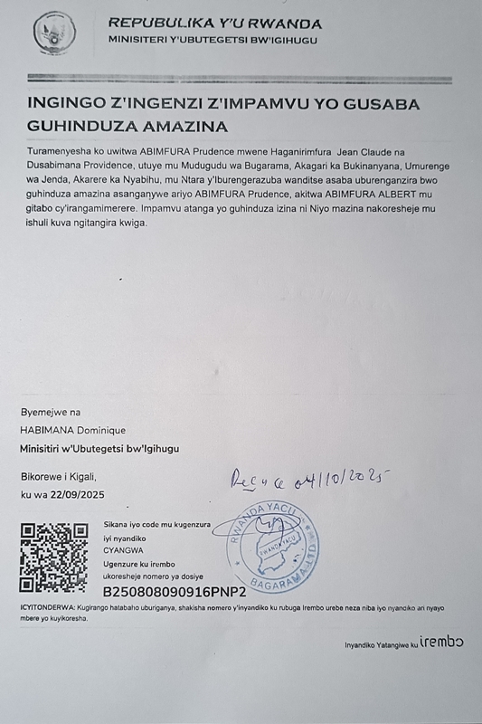 Uwitwa ABIMFURA PRUDENCE, mwene Haganimfura Jean Claude na Dusabimana Providence, yandikiye MINALOC, asaba guhinduza amazina asanganywe ariyo ABIMFURA PRUDENCE, akitwa ABIMFURA aLBERT. Mu gitabo cy’irangamimere Impamvu atanga yo guhinduza izina ni yo mazina yakoresheje mu ishuri.