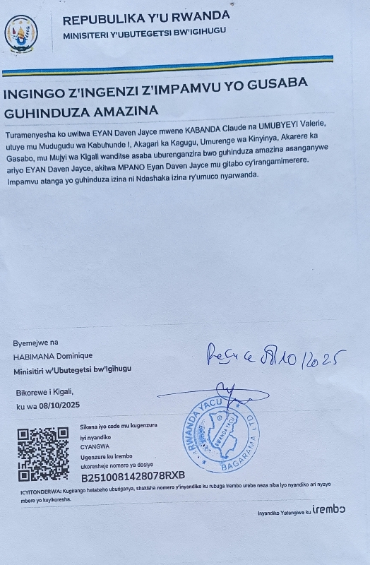 Uwitwa EYAN DAVEN JAYCE , mwene Kabanda Claude na Umubyeyi Valerie, yandikiye MINALOC, asaba guhinduza amazina asanganywe ariyo EYAN DAVEN JAYCE, akitwa MPANO EYAN DAVEN JAYCE, mu gitabo cy’irangamimerere.Impamvu atanga yo guhinduza izina ni izina ry’umuco Nyarwanda.