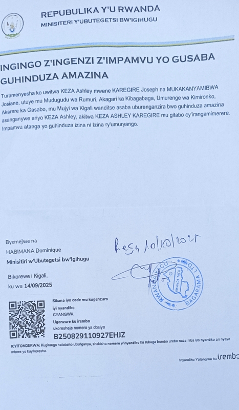 Uwitwa KEZA ASHLEY mwene Karegire Joseph na Mukakanyamibwa Josiane, yandikiye MINALOC, asaba uburenganzira bwo guhinduza amazina asanganywe ariyo KEZA Ashley , akitwa KEZA ASHLEY KAREGIRE mu gitabo cy’irangamimerere.impamvu atanga yo guhinduza izina ni ixzina ry’umuryango.