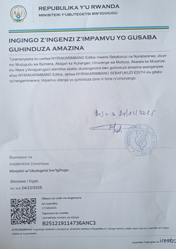 Uwitwa NYIRAKARIMBANO EDITH , Mwene Sebafukuzi na Nyiraberwa, yandikiye MINALOC, asaba gihinduza amazina asanganywe , ariyo NYIRAKARIMBANO EDITH, akitwa NYIRAKARIMBANO SEBAFUKUZI EDITH., mu gitabo cy’irangamimrere.Impamvu atanga yo guhinduza izina ni izina ry’umuryango.