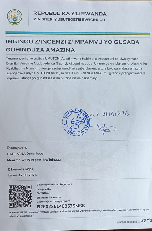 Uwitwa UMUTONI ASFATI, mwene Habimana Assouman na Uwizeyimana Djamila, yandikiye MINALOC, asaba uburenganzira bwo guhinduza amazina asanganywe ariyo, UMUTONI ASFATI, akitwa KAYITESI SOLANGE, mu gitabo cy’irangamimerere.Impamvu atanga yo guhinduza izina ni izina yiswe n’ababyeyi.