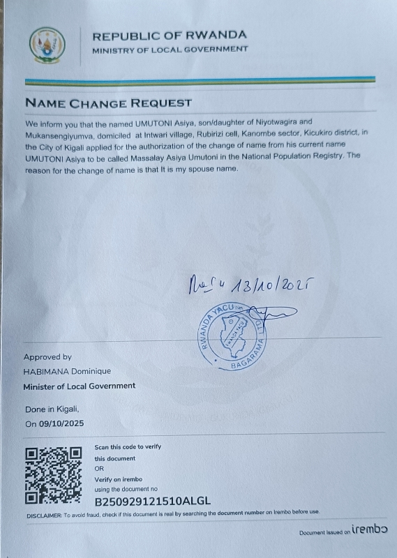 We inform that the named UMUTONI ASIYA , daughter of   NIYOTWAGIRA and MUKANSENGIMANA,applied for the authorization of the change of the from his current name UMUTONI ASIYA to be called MASSALAY ASIYA UMUTONI in the population Registry .The reason for the change of name is that It is his spouse name.