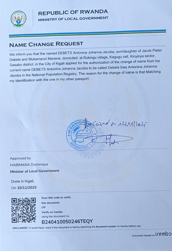 DEBETS ANTONINA JOHANNA JACOBA, Son/daughter of Jacob Pieter Debets and Mukamanzi Mariane, applied for the autholization of the change of the change of name from his current name,DEBETS ANTONINA JOHANNA JACOBA ,to be called ,DEBETS INES ANTONINA JOHANNA JACOBA in the National Population Registry. The reason for the change of name is that it is a name Matching her identification with the one in his other passport.